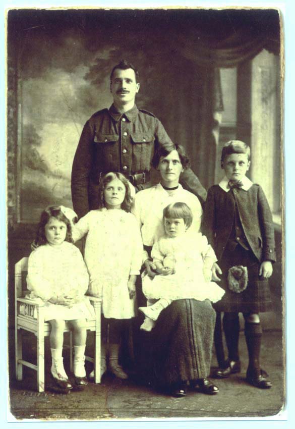 The earliest family photograph in my possession dating from 1914/15 - that of my maternal grandfather & grandmother together with, in order of age, my late uncle Jack, my mother, my aunt Estella (sitting), and my aunt Mabel (on my grandmother's knee). I guess it was taken because my grandfather was about to go into action with the Kings Own Scottish Borderers. In fact he was wounded twice. A larger picture is shown on the previous page